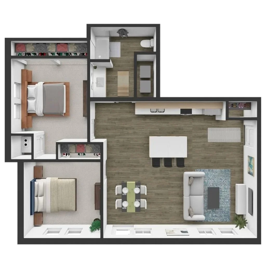 Bearing the name of an entrepreneurial industrialist family, the Dickson Flat is a flexible, efficiently-designed apartment for roommates, a young family or a couple who need a bit more space. The open-plan with large kitchen island provides ample space for cooking, dining, living and entertaining, and a generous 6’ x 11’ balcony expands the floor space. The rest of the suite offers two private bedrooms, including a comfortable corner master bedroom with plenty of natural daylight and a walk-in closet, a bathroom with walk-in shower and an in-unit washer/dryer.