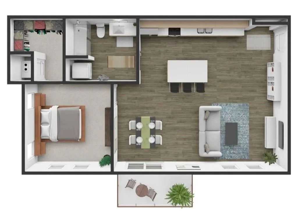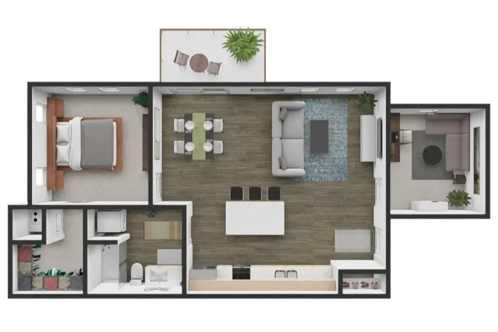 Named after the partner who returned home to build an empire, the Fraser Flat is a flexible, efficiently-designed apartment for those who need a little extra space. The open-plan with large kitchen island provides ample space for cooking, dining, living and entertaining. A generous 6’ x 11’ balcony expands the useable floor space, a comfortable corner bedroom offers plenty of daylight and walk-in closet, and the bathroom includes a walk-in shower and in-unit washer/dryer. And the den offers a private room for a work-from-home office, media room or visiting guests.